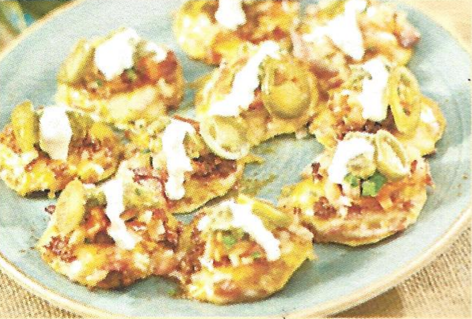 Grilled shrimp chopped with onions & covered in cheese dip