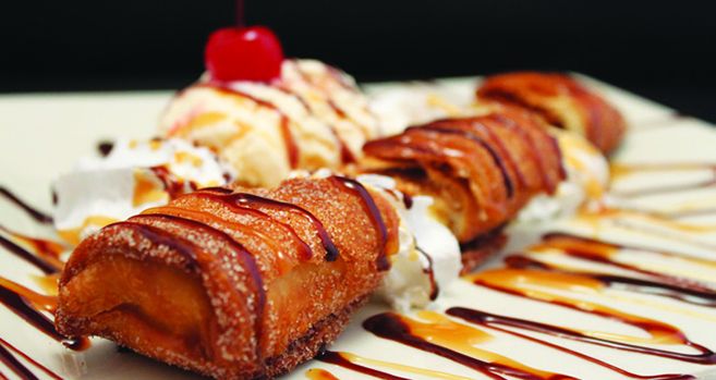 2 ~ Fried Chicken Burrito, Fried Chicken Taquito topped with Cheese Dip, Rice & Beans